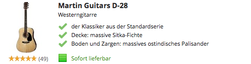 Wer selbst mit dem Gedanken spielt sich eine Martin D-28 zu leisten, dem empfehlen wir sich beim Musikhaus Thomann umzuschauen. Die Lieferung innerhalb Deutschlands ist übrigens versandkostenfrei:
